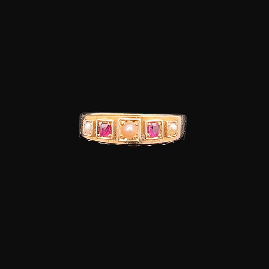 Antique Victorian Natural Split Pearl and Ruby 15ct Gold 5 Stone Ring