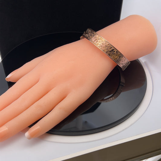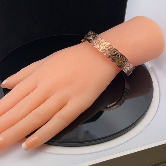 Antique Art Deco 9ct Rose Gold Hinged Bangle with Engraved Foliate Motifs