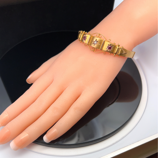 Antique Edwardian Star Set Diamond and Ruby 9ct Gold Etruscan Revival Bangle