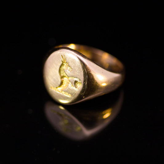 Antique 18ct Gold Seal Engraved Signet Ring. Hamilton Family Crest English Hallmarked 1922.