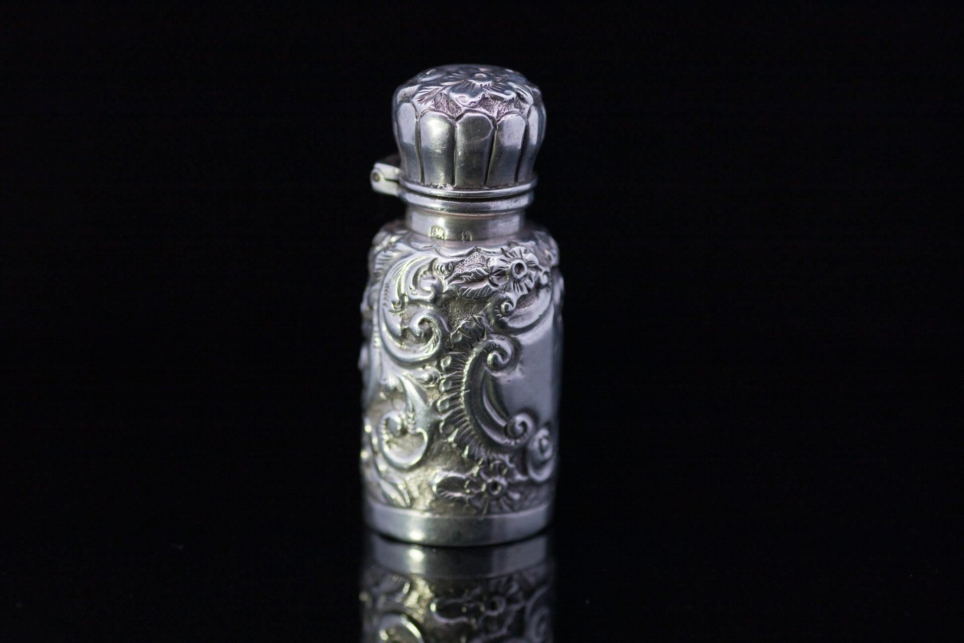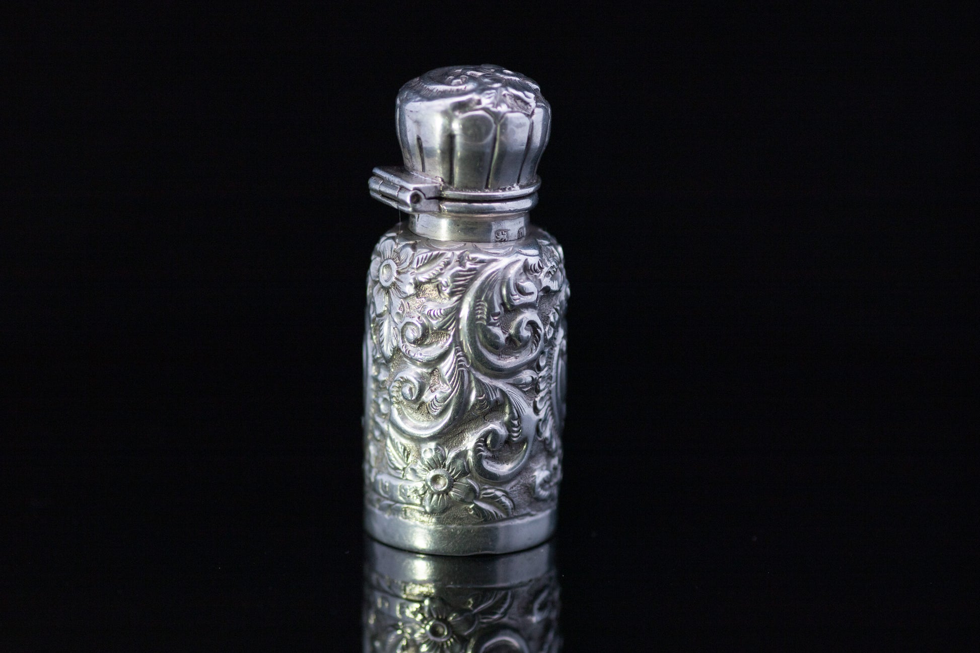 Intricately chased and engraved with floral motifs, the scent bottle is accompanied by its original glass stopper.
