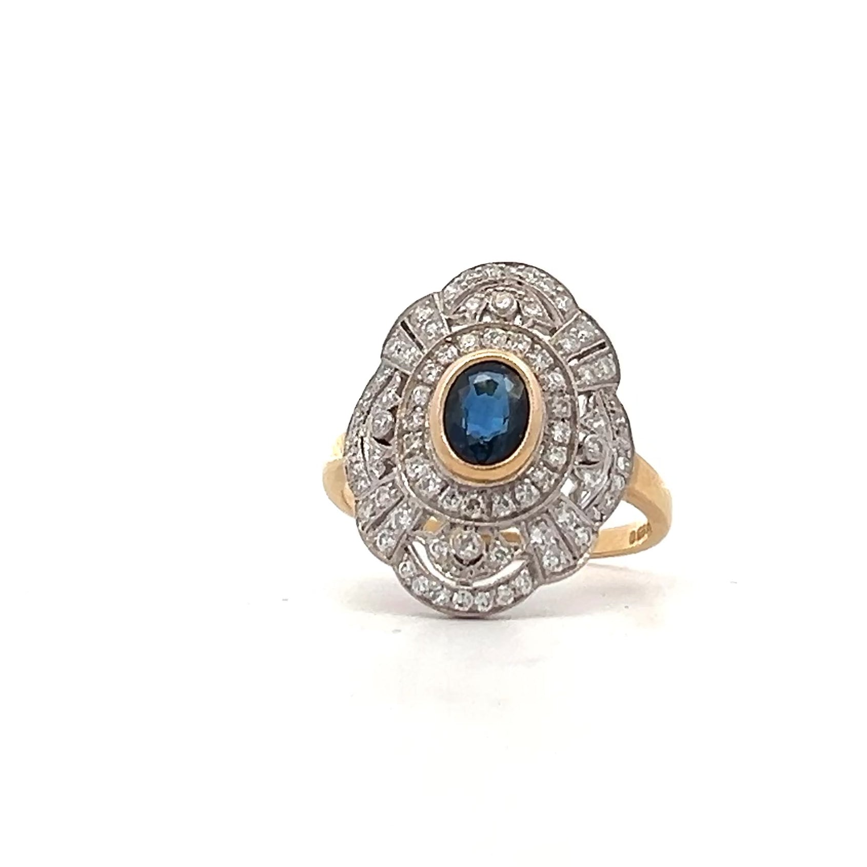 This lovely ring has a large oval sapphire in the centre with natural diamonds arranged in a geometric art deco cluster around the principal stone.